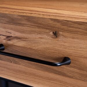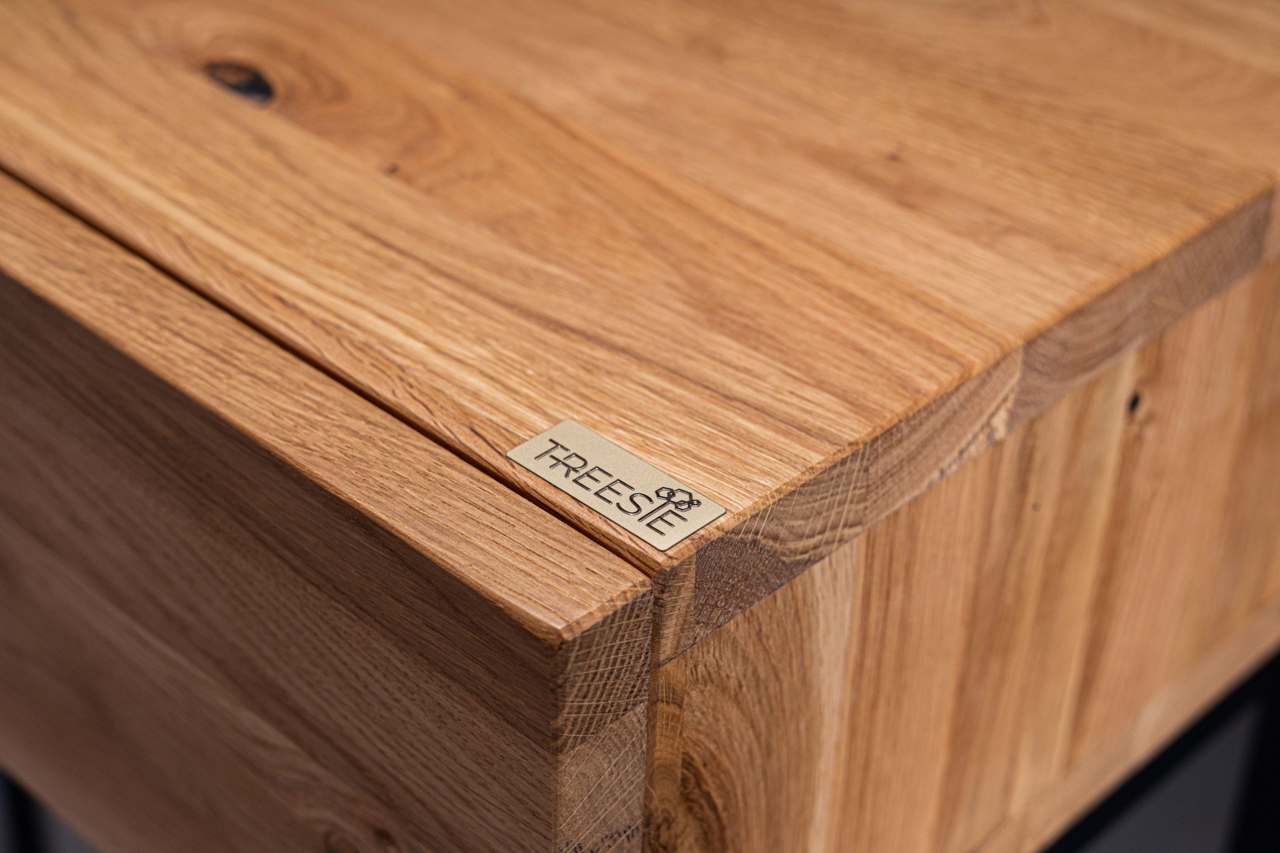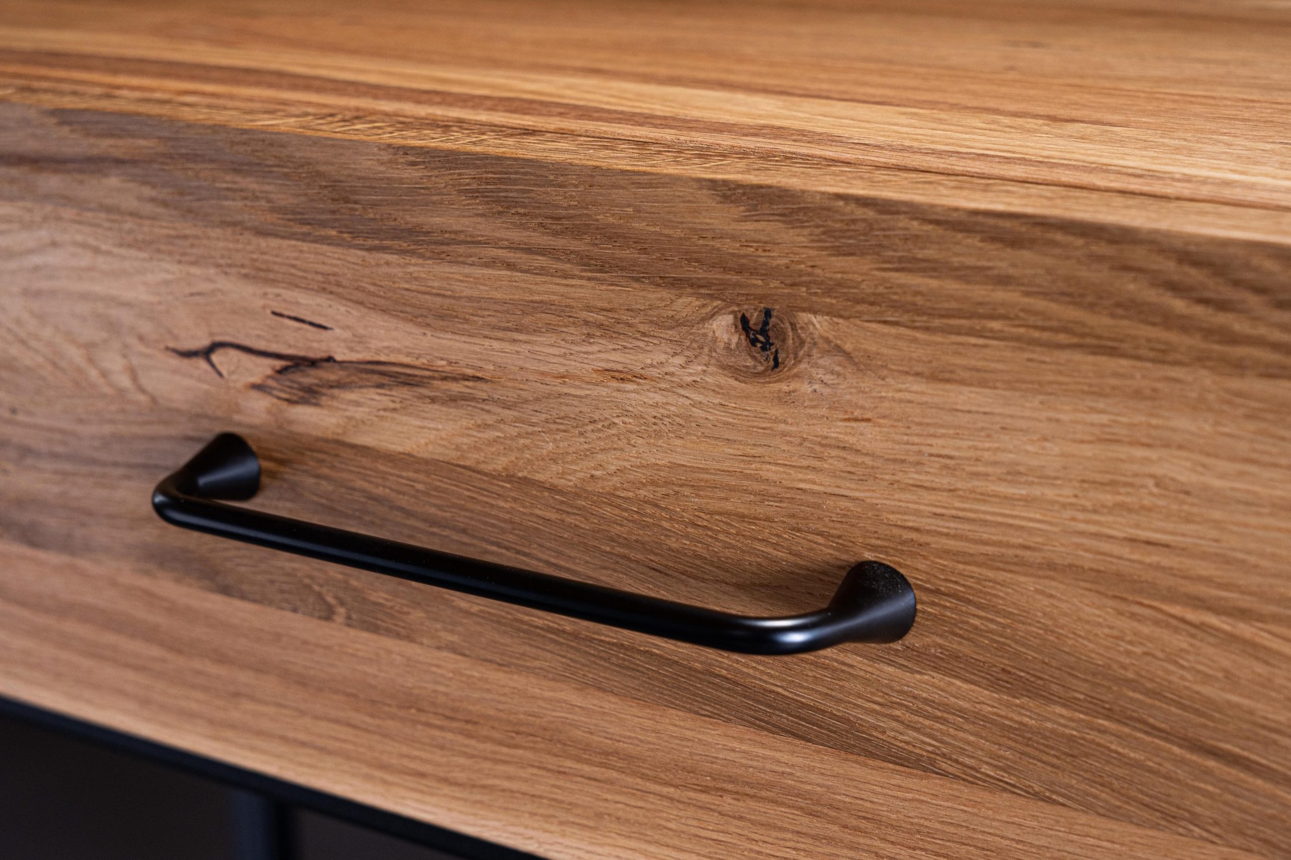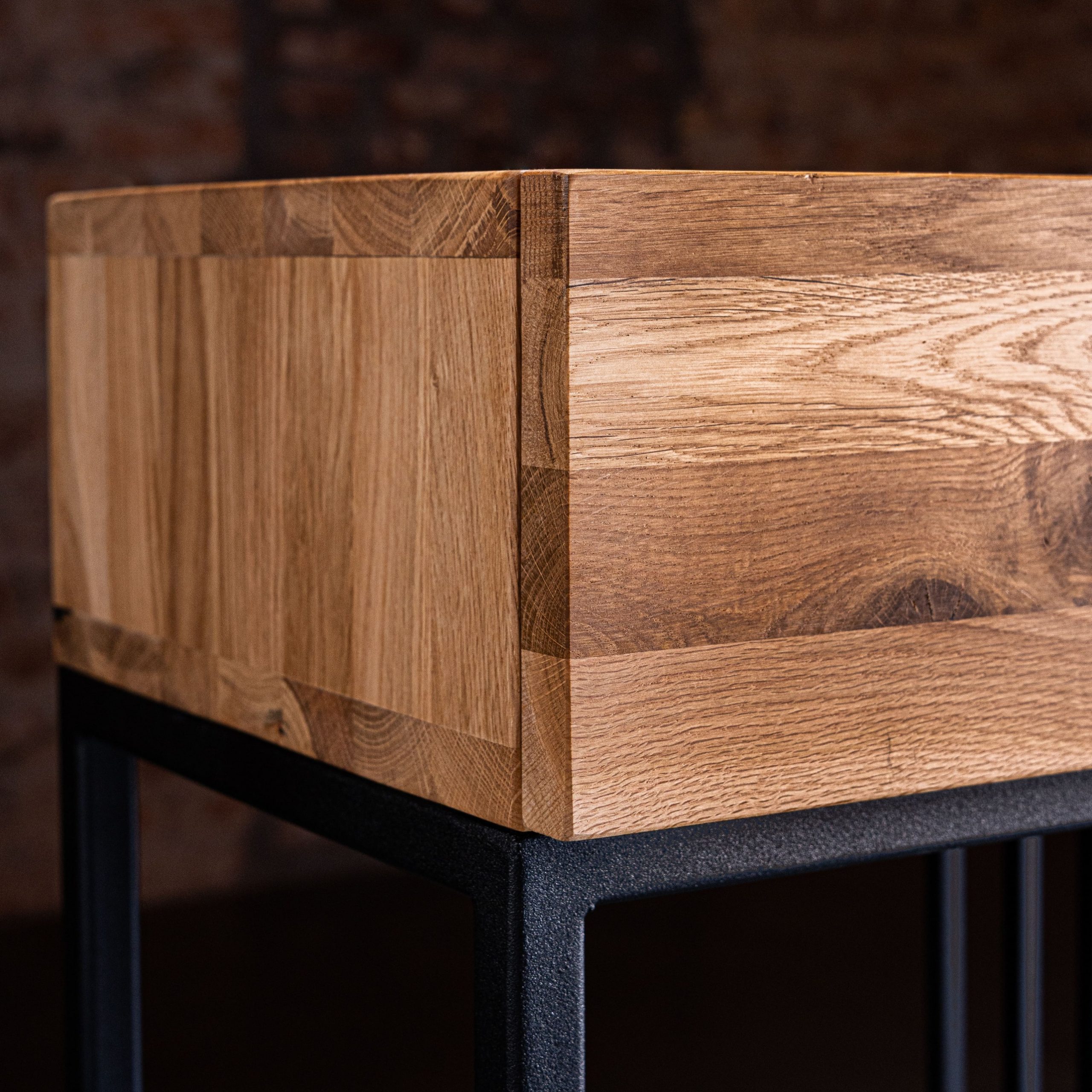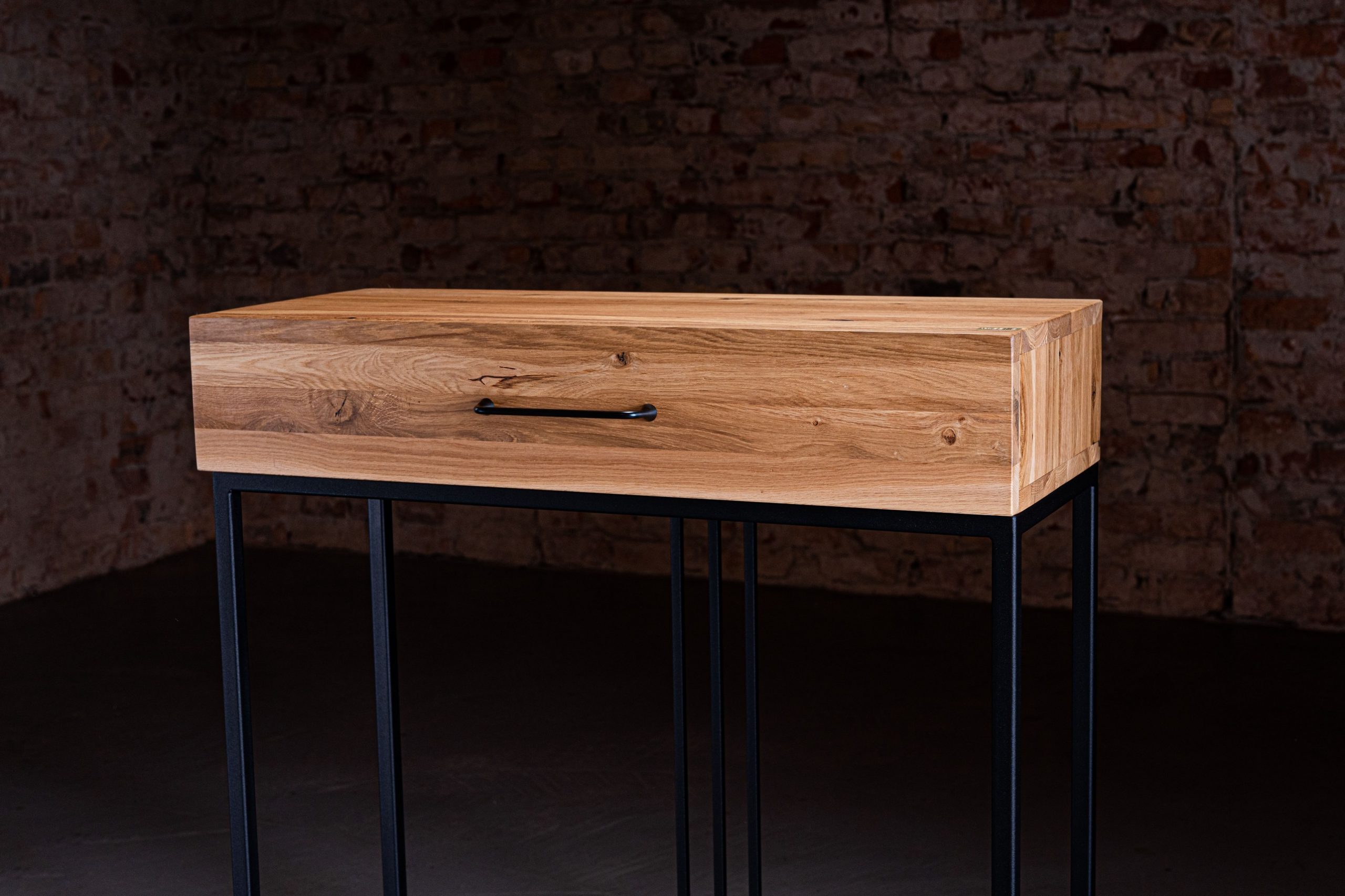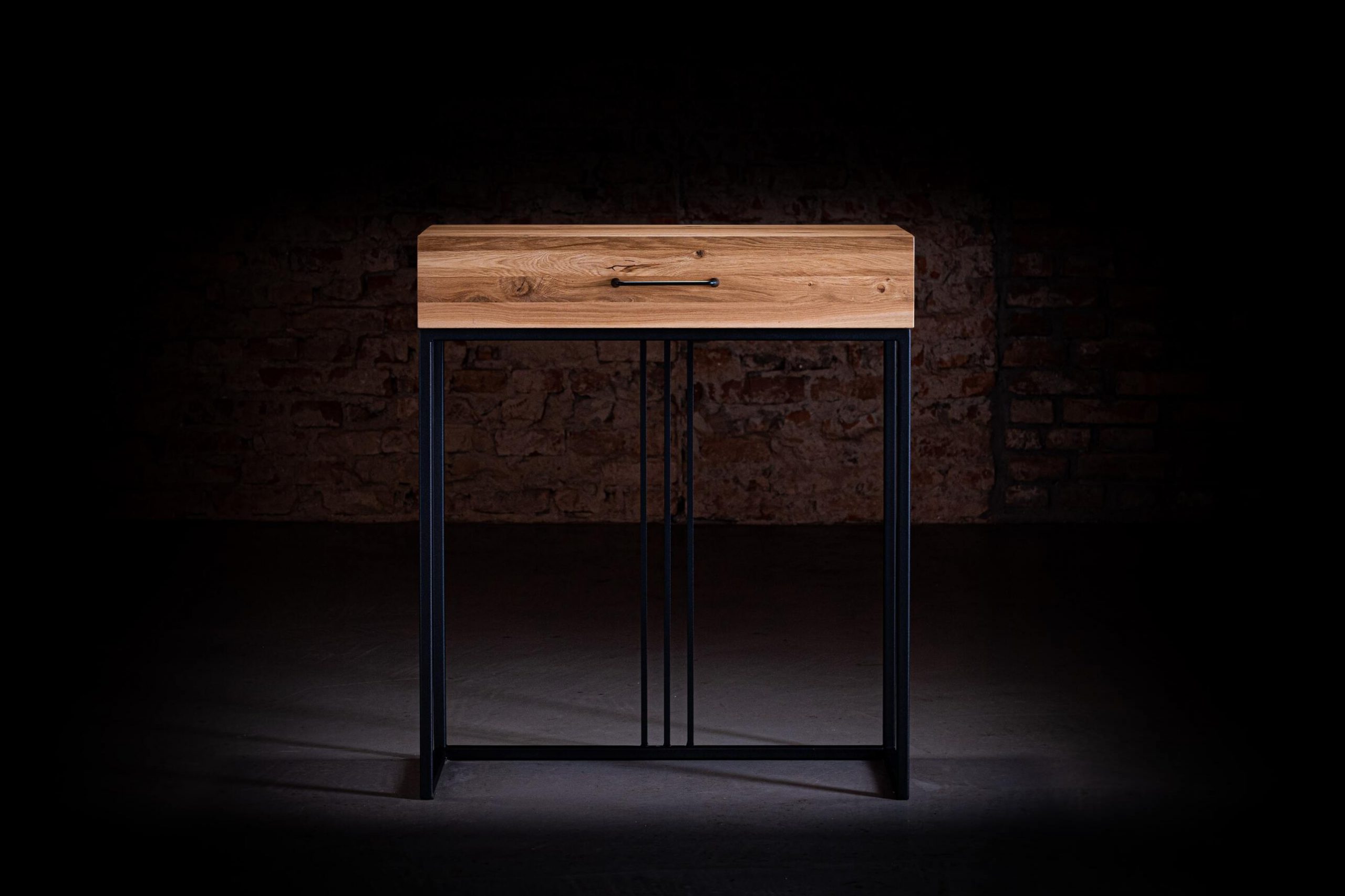Ponadto masz możliwość jej personalizacji – od Ciebie będzie zależał odcień blatu, kolor stelaża czy uchwytów! Na zdjęciach znajduje się konsola drewniana 80 cm (z dębowym blatem rustykalnym) w wybarwieniu naturalnym, a także ze stelażem (RAL 9005), z szufladą oraz uchwytem w czarnej barwie.