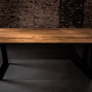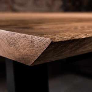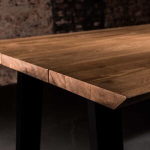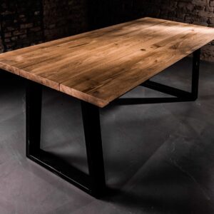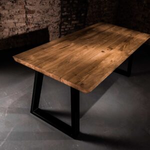 Nowoczesne rozwiązanie blatu dębowego, który składa się z trzech części wraz ze stalową podstawą malowaną proszkowo.
