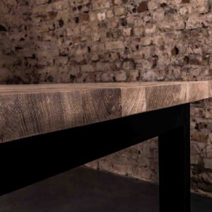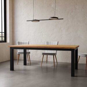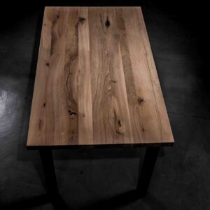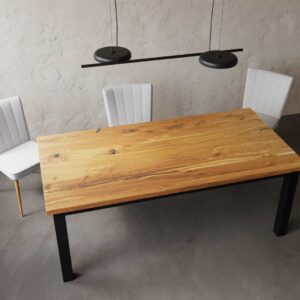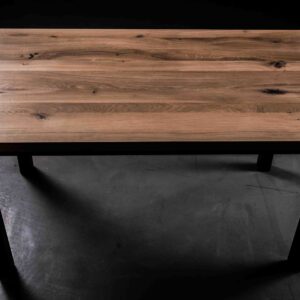 klasyczne połączenie blatu dębowego wraz ze stalową podstawą malowaną proszkowo.