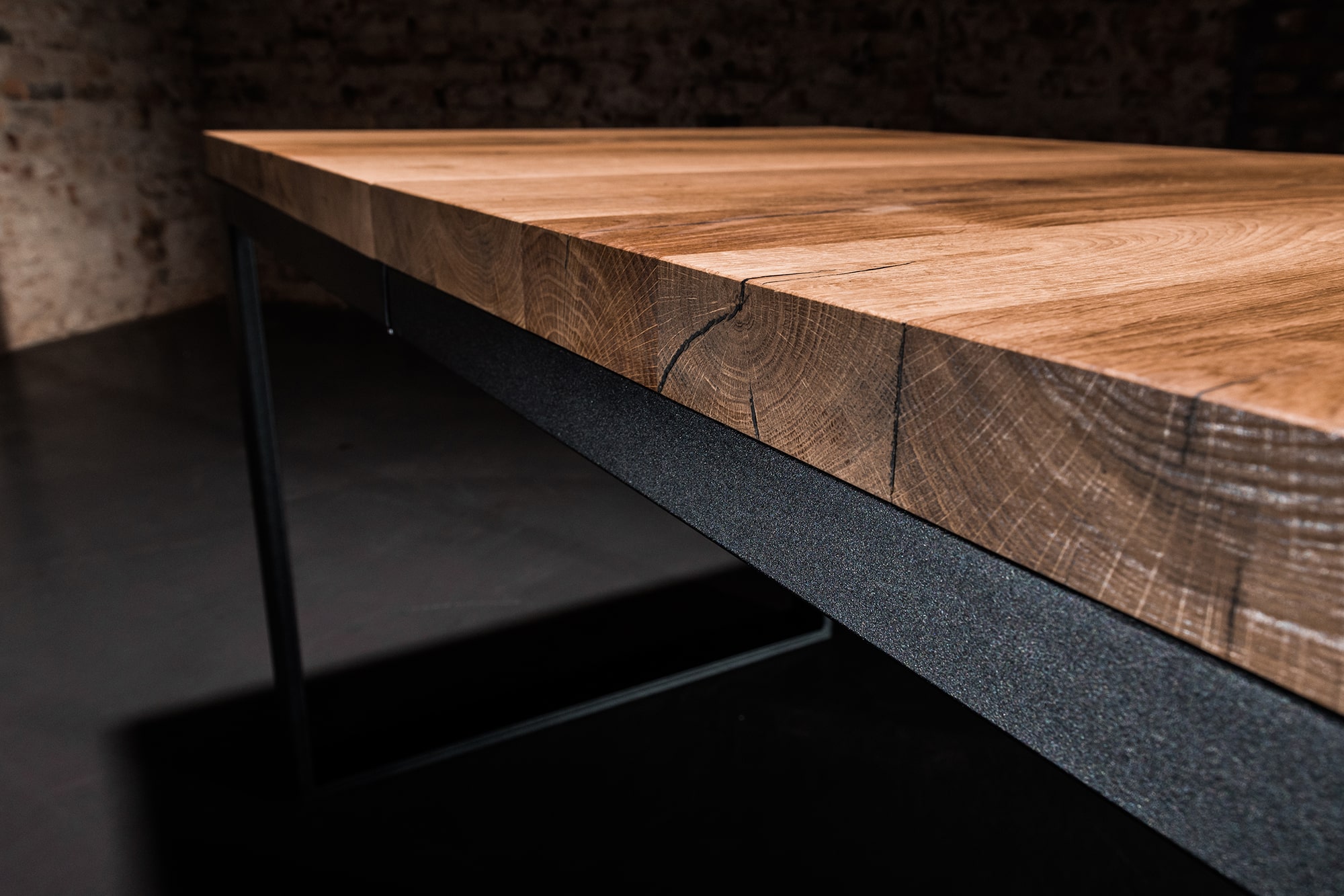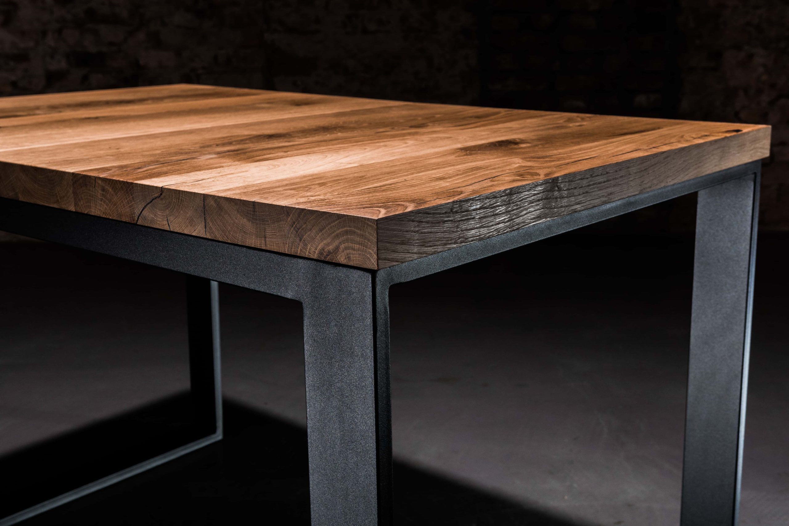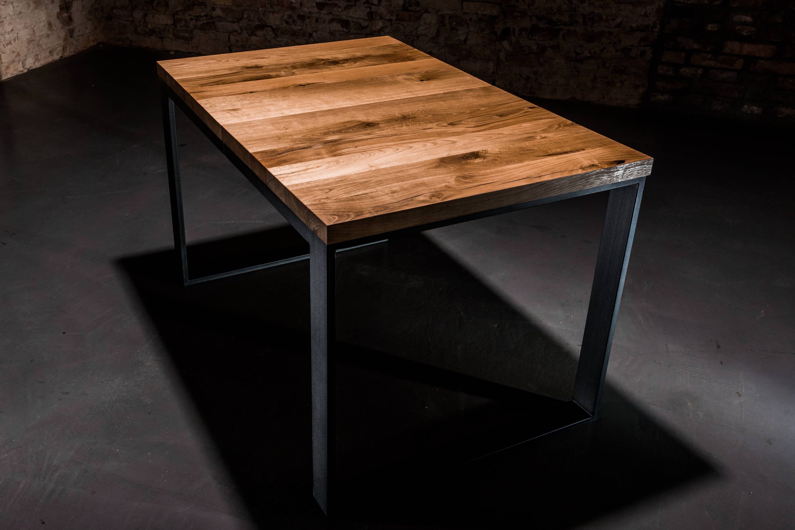 Solidna konstrukcja blatu wykonana została z drewna dębowego zabezpieczonego olejem, podbijającym jego naturalną lub dowolnie wybraną barwę oraz gwarantującym hydrofobowość. W połączeniu z podstawą malowaną proszkowo nadaje meblowi nowoczesnego wyglądu. Oferujemy możliwość personalizacji zarówno rozmiaru stołu, jak i wybarwienia blatu: