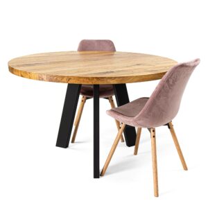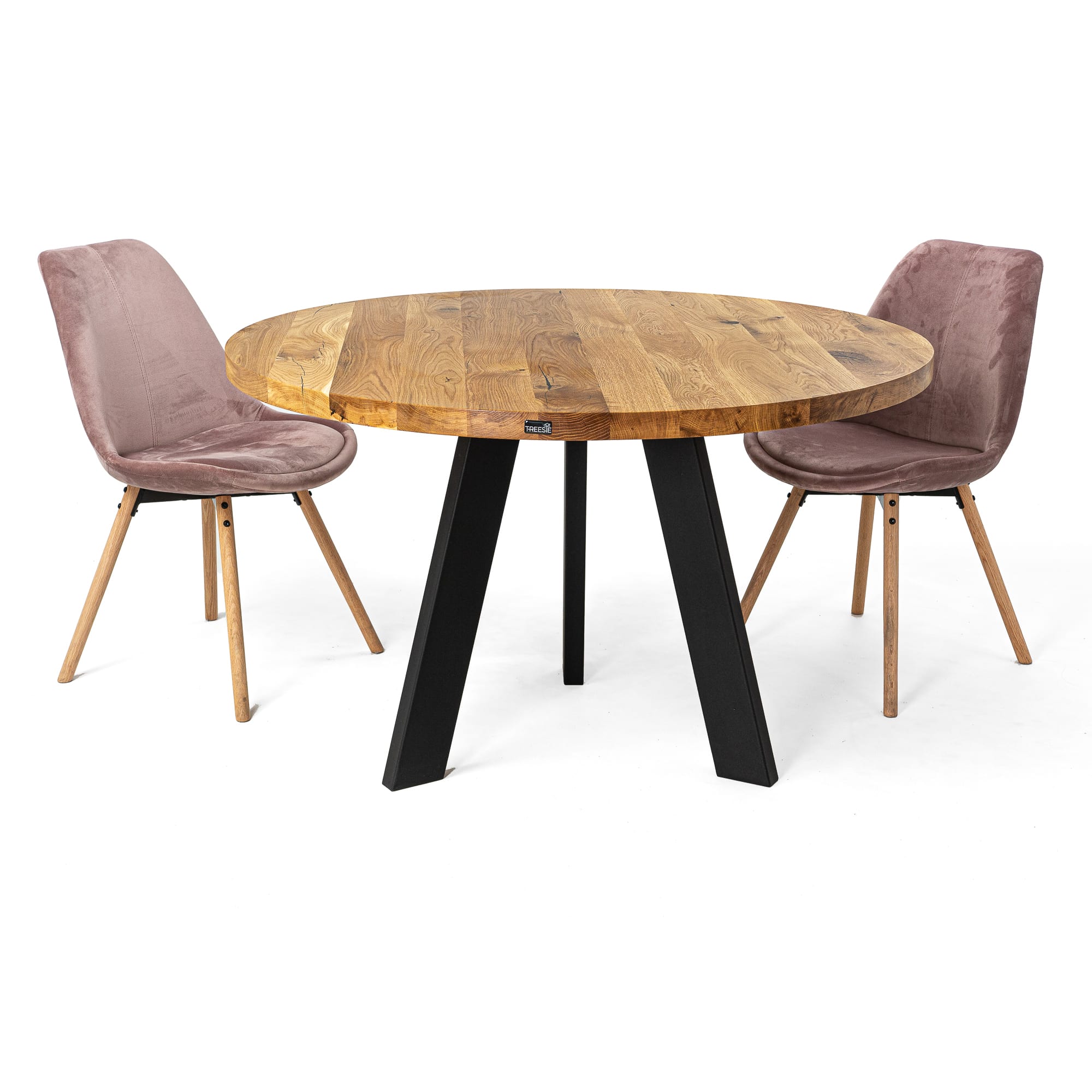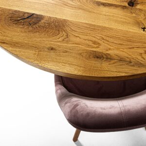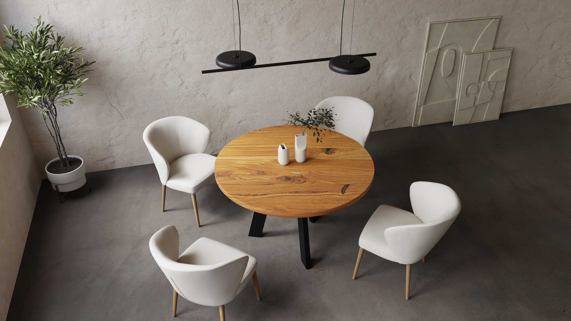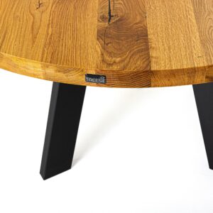 Na zdjęciu stół miał dębowy blat rustykalny z czarnym wypełnieniem zaolejowany olejem naturalnym o średnicy 120cm.