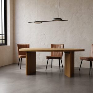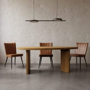 Nasza nowa seria stołów z owalnymi do jadalni blatami zdecydowanie ma wszystko, czego potrzeba, aby stać się głównym elementem aranżacji. Geometrycznie ukształtowane dębowe nogi oraz owalny blat wygląda niesamowicie elegancko oraz nowocześnie.