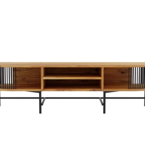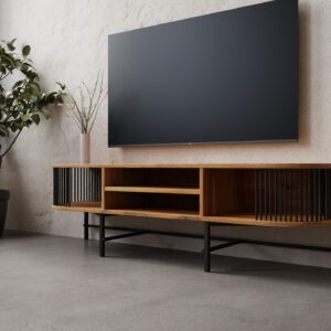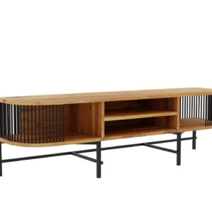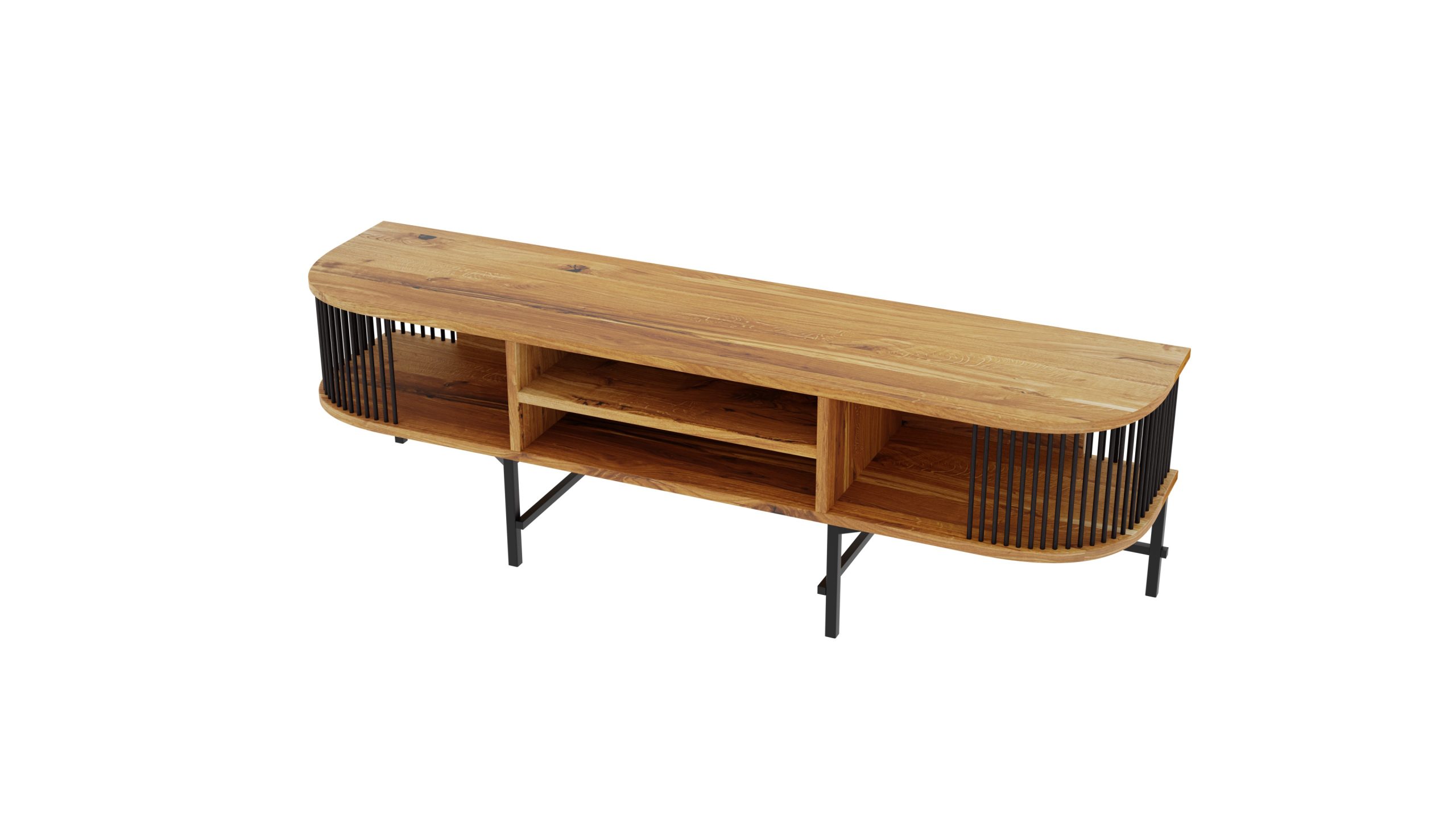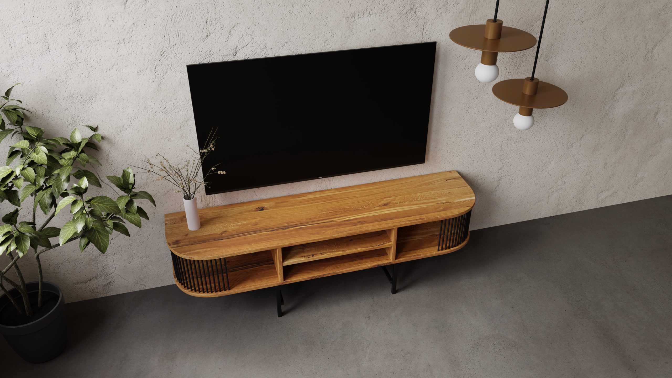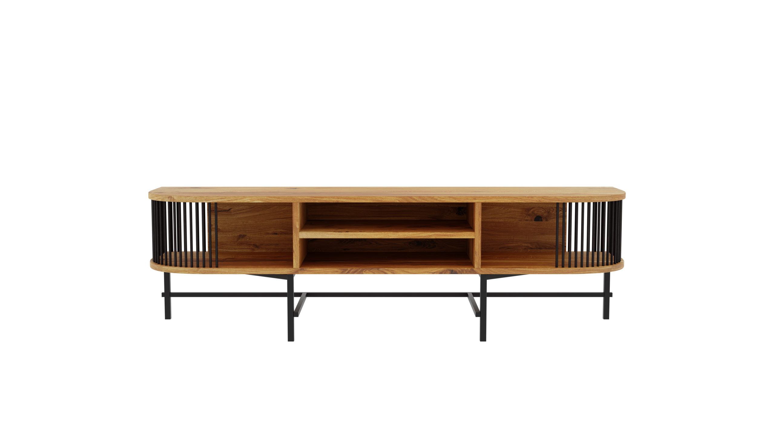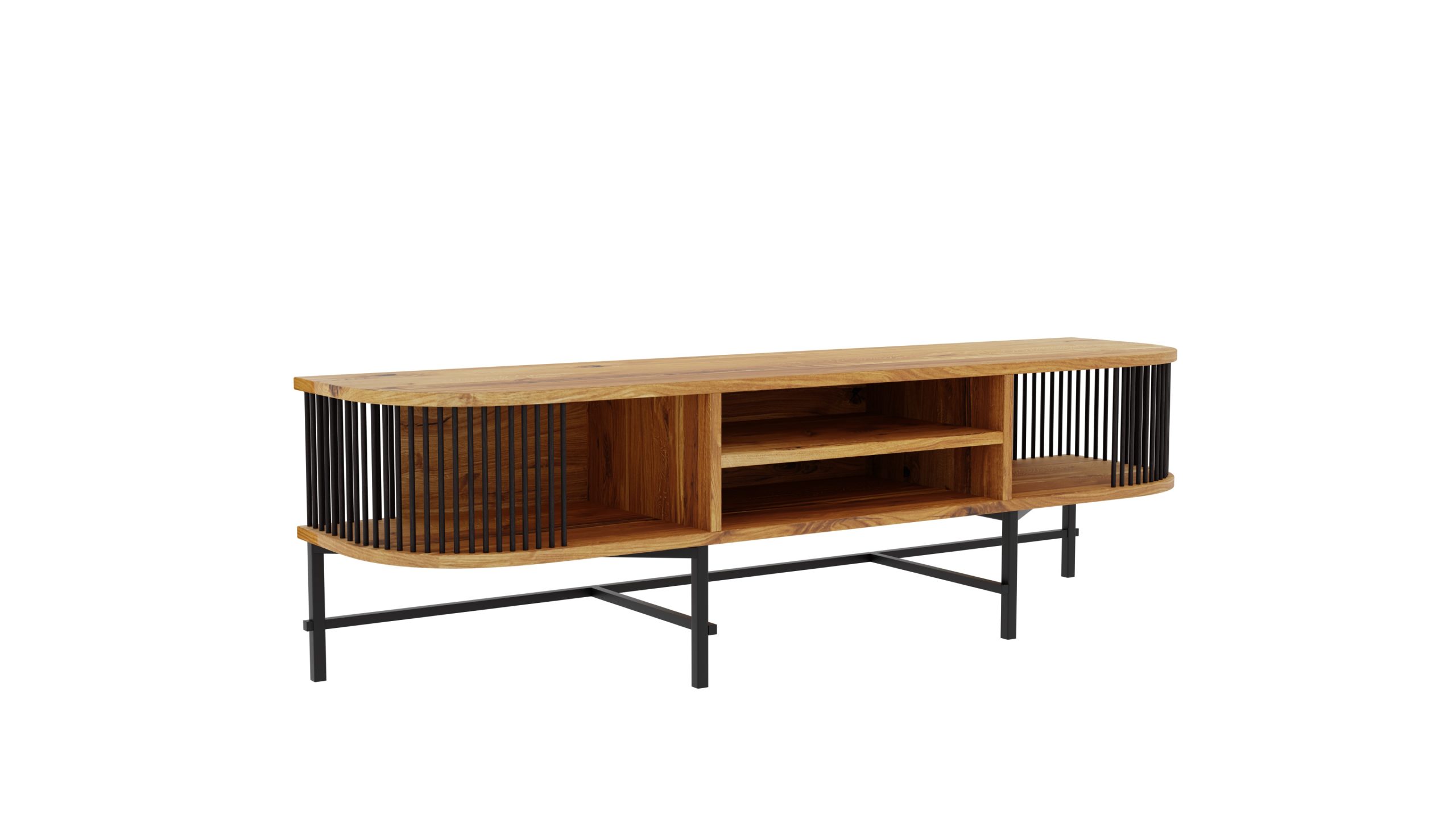 Ponadczasowe piękno drewna dębowego z którego została wykonana  nasza szafka RTV wraz z drewnianymi drążkami ozdobnymi oraz stabilnej, delikatnej stalowej konstrukcji  to pewna propozycja dla nowoczesnych salonów.