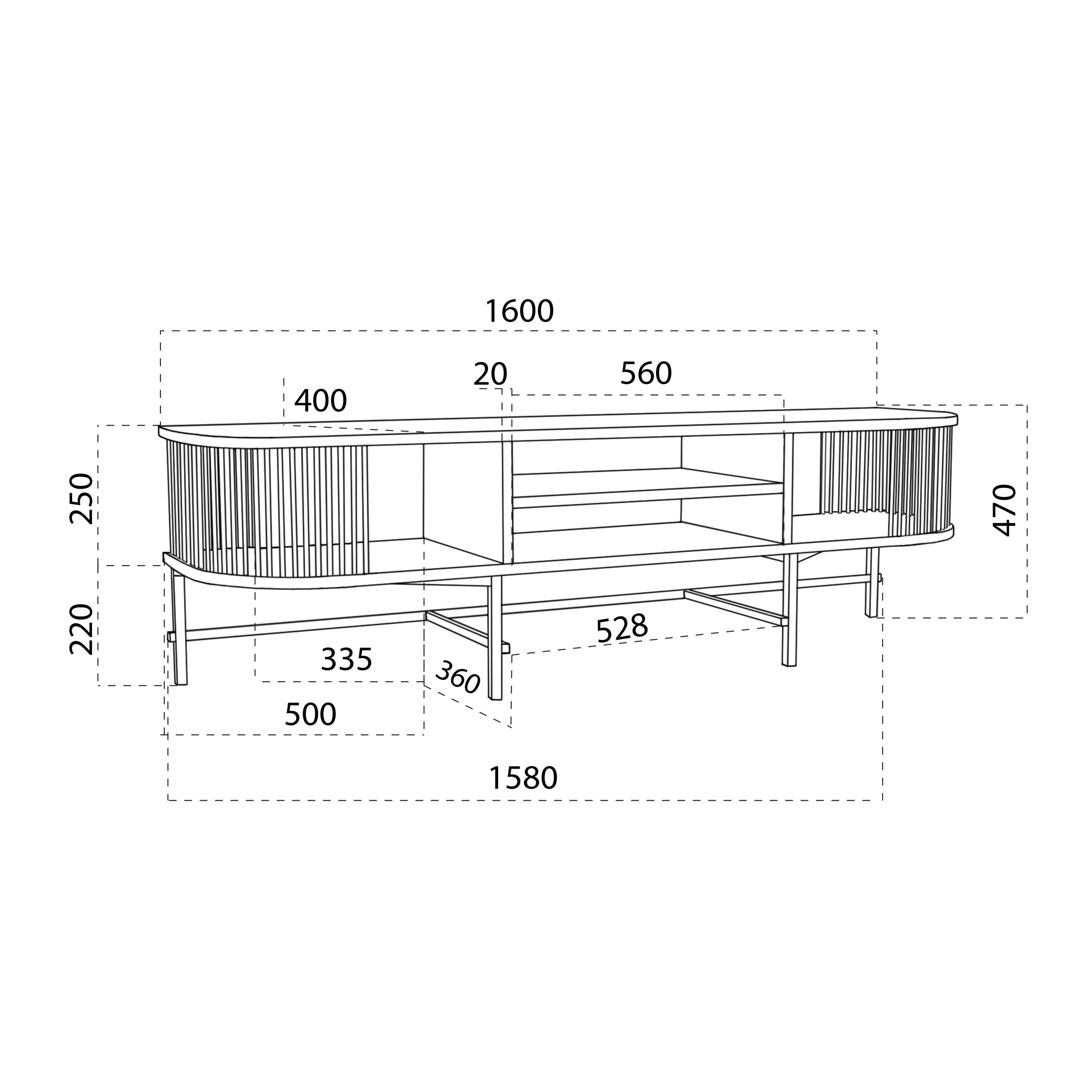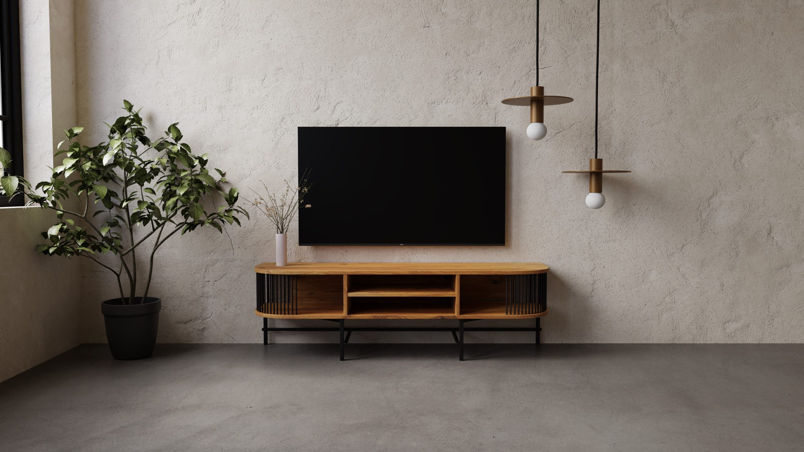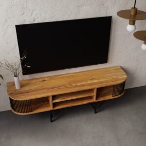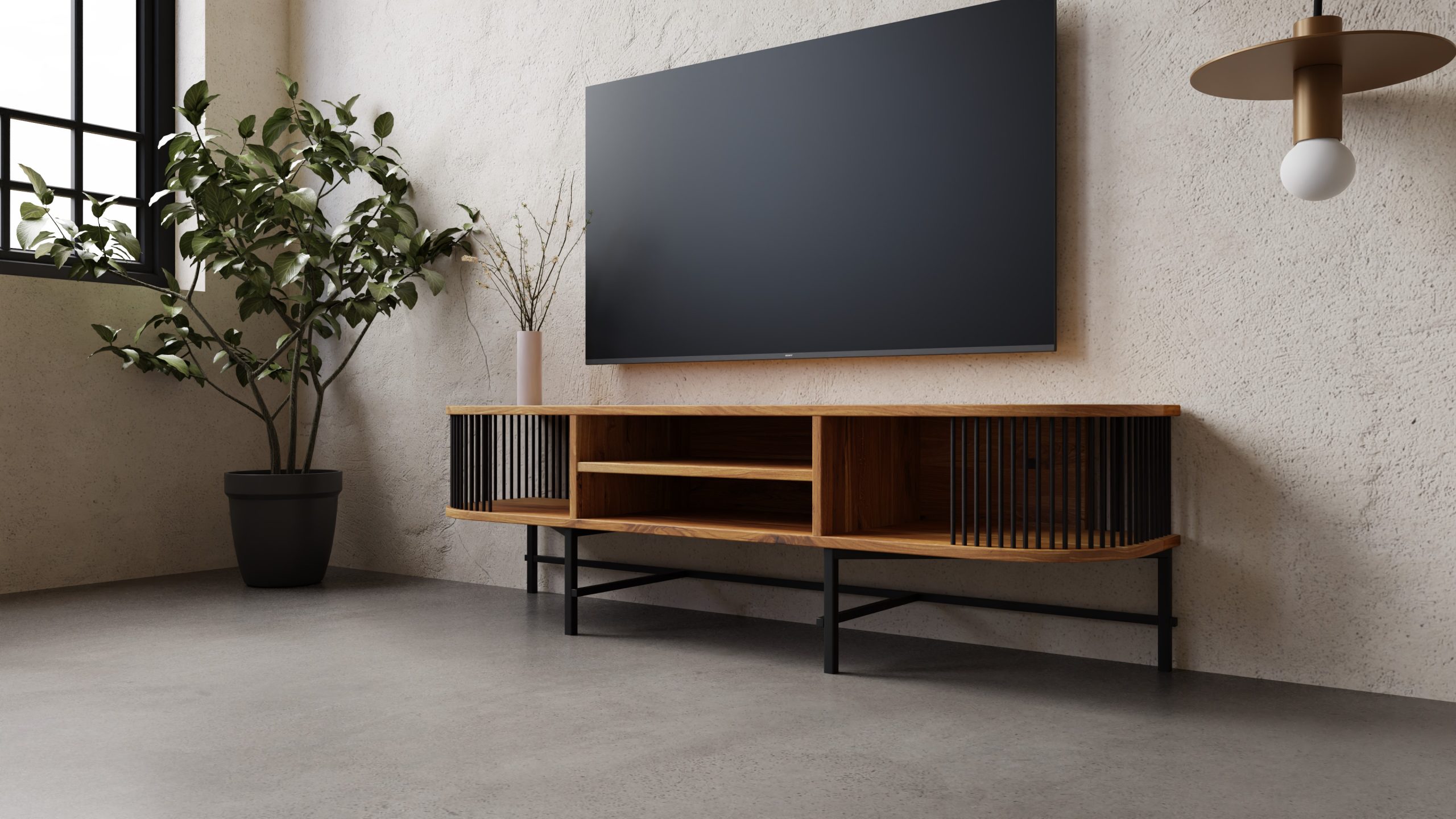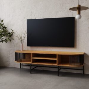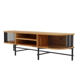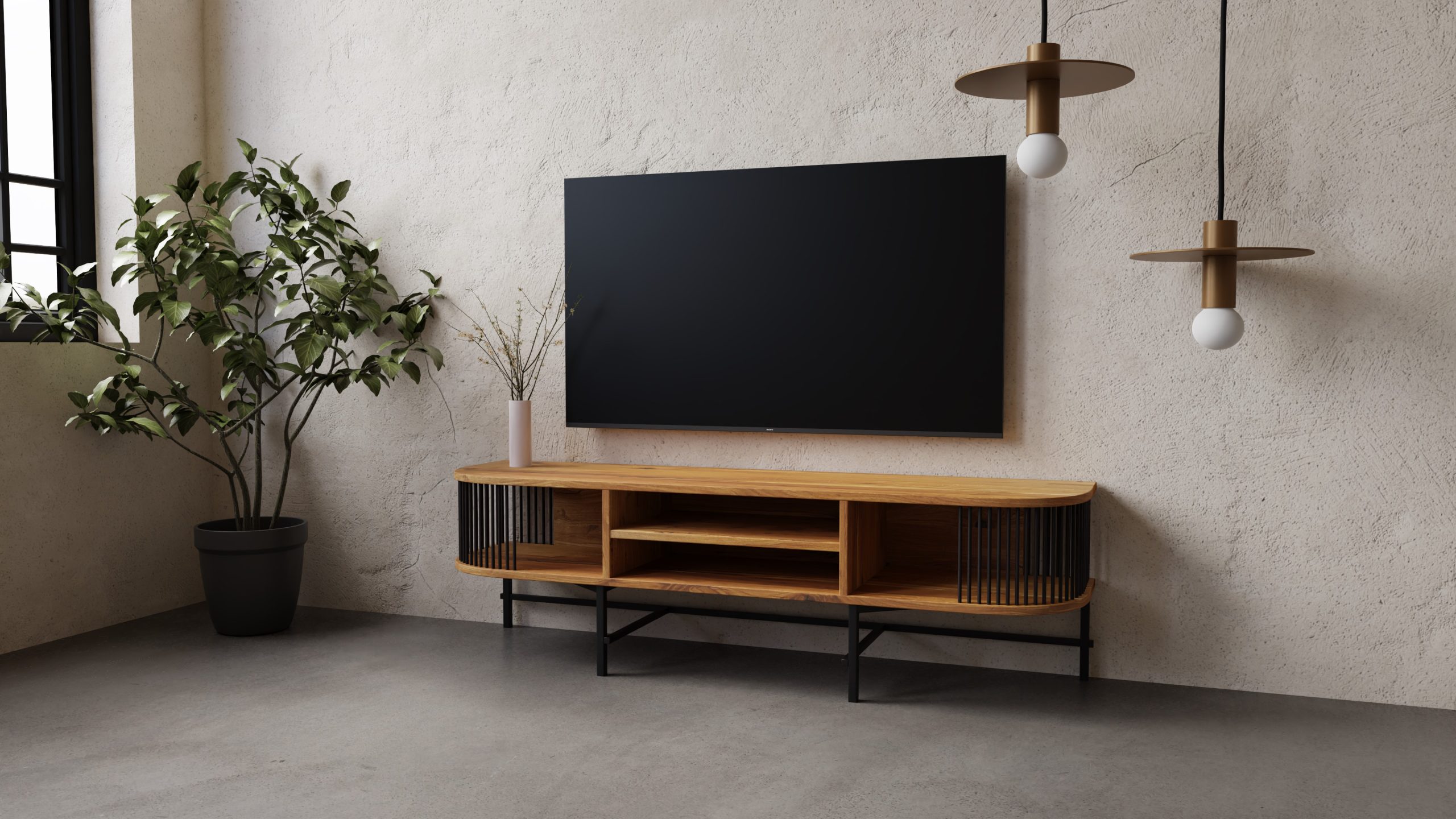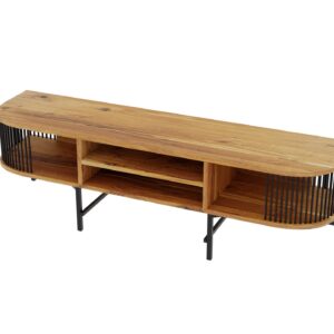 Ponadczasowe piękno drewna dębowego z którego została wykonana  nasza szafka RTV wraz z drewnianymi drążkami ozdobnymi oraz stabilnej, delikatnej stalowej konstrukcji  to pewna propozycja dla nowoczesnych salonów.